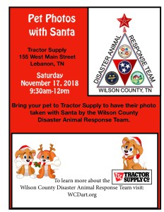 Wilson Co DART will be at Tractor Supply in Lebanon TN, on November 17, 2018 with SANTA from 9:30 till 12 noon……Come on out and bring the family and furry family! Claudia Richardson, WCDART Photographer will be on site taking Christmas photos. You will be all set for the Holidays with your festive photos and helping support the WC DART Team, we are asking for a $5 Donation.