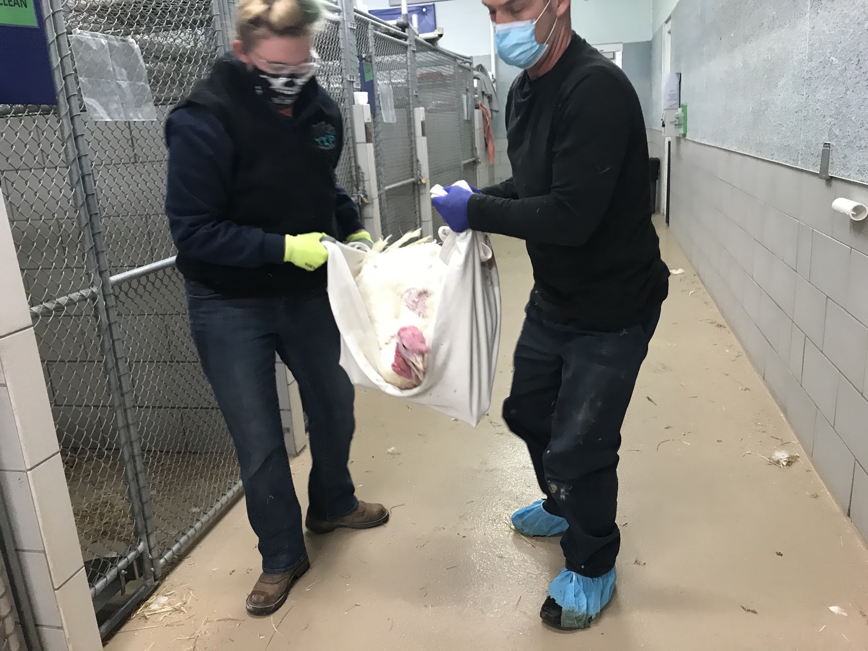 Adrienne and Kim came up with a “Fireman’s Sling” to carry the Turkeys ! Which made carrying the 50 lb birds safer and easier for all involved plus expedited the loading of the birds!